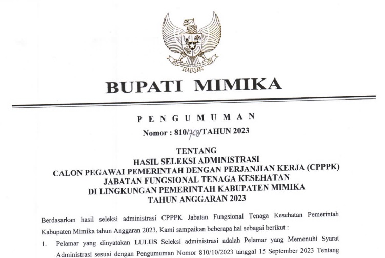 Pengumuman Bupati Mimika tentang Hasil Seleksi Administrasi CPPPK JF Nakes dan Guru Tahun Anggaran 2023